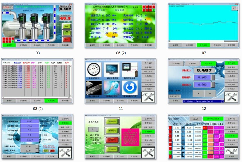 5、显示内容丰富:能显示每台水泵工作状态和实时显示:压力、频率、功率、电流、 水位、压力曲线、电度表,变频器温度、柜内温度、各种报警信息(并能显示变 频中各种参数和报警信息。让你一目了然)。超压停泵;报警复位(并有黑 匣子 功能:可记录30天内部每一分钟运行输出压力,频率、功率、电流、电压并 记 录报警信息时间和一系统参数等)完善功能可免去值班人员。