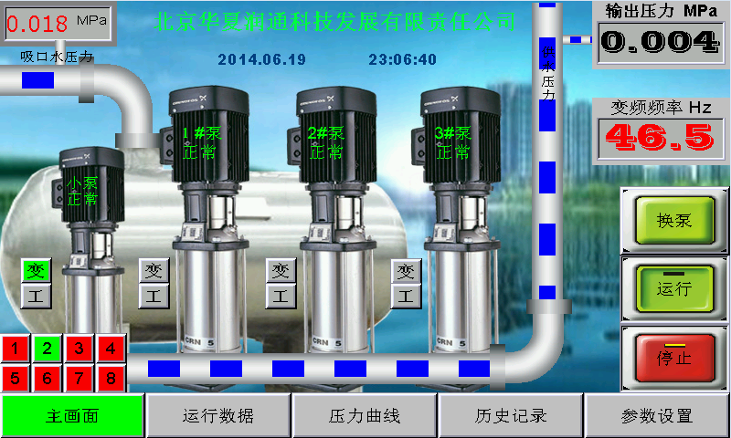 本控制系统,通过PLC的模块把压力,运行状态,故障信息,变频运转参数,环境温度,水泵的频度、电流、功率、耗电量,电子电度表及常用信息等“耗电量”,“电子电度表”及常用信息等。记录下来,可存储一年内数据。采用CF卡或U盘存储信息,也在电脑上读出数据,并可打印。 仅此功能可大大降低值班人员劳动力,这些信息都能记录下来,每分钟记录一次,可记录全年运行信息。