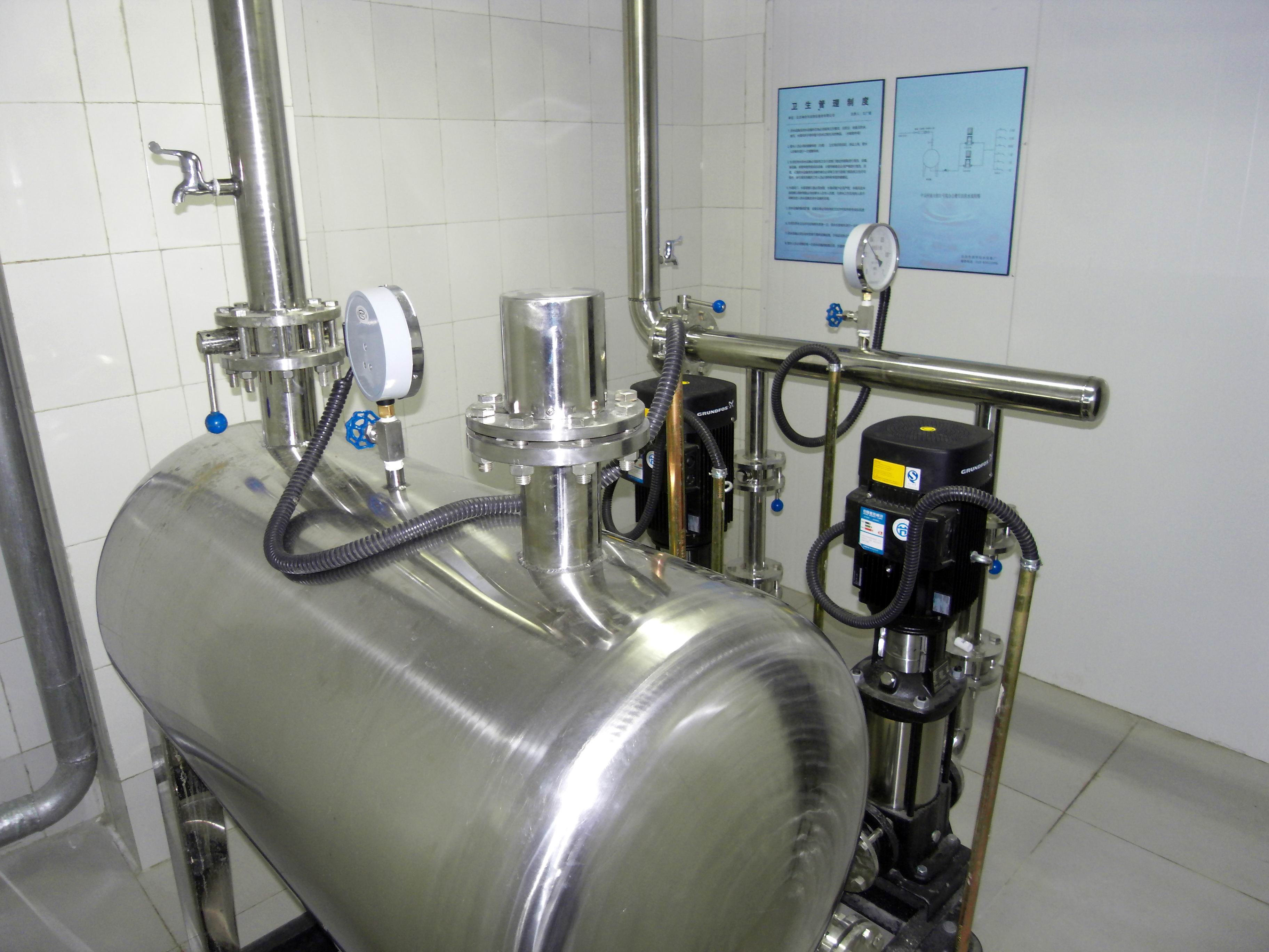 无负压管网叠压供水设备。该设备全封闭设计,可直接与自来水管网连接,通过自动补气装置和流量调节器保护自来水管网不形成负压,保证了自来水管网稳压(无负压)、安全、卫生的向用户供水,避免了修建混凝土蓄水池或设水箱的麻烦。该设备充分利用了自来水管网的原有压力,在原有压力的基础上实现压力叠加,实现差多少,补多少,使二次加压设备的选型减小,节省投资,同时在使用过程中也可大大节能,是目前先进的新型的二次供水方式。