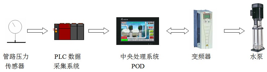 我公司利用POD微机的强大处理功能,首先把管路的压力采集到POD微机中,再把管路实时压力,经过CPU处理程序后输出到变频器中,能准确控制水泵出水或进水压力,控制精度更高,安全稳定更加可靠,操作也更加方便。
