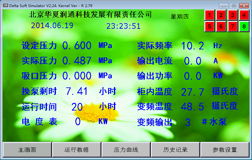 本控制系统,通过PLC的模块把压力,运行状态,故障信息,变频运转参数,环境温度,水泵的频度、电流、功率、耗电量,电子电度表及常用信息等“耗电量”,“电子电度表”及常用信息等。记录下来,可存储一年内数据。采用CF卡或U盘存储信息,也在电脑上读出数据,并可打印。 仅此功能可大大降低值班人员劳动力,这些信息都能记录下来,每分钟记录一次,可记录全年运行信息。